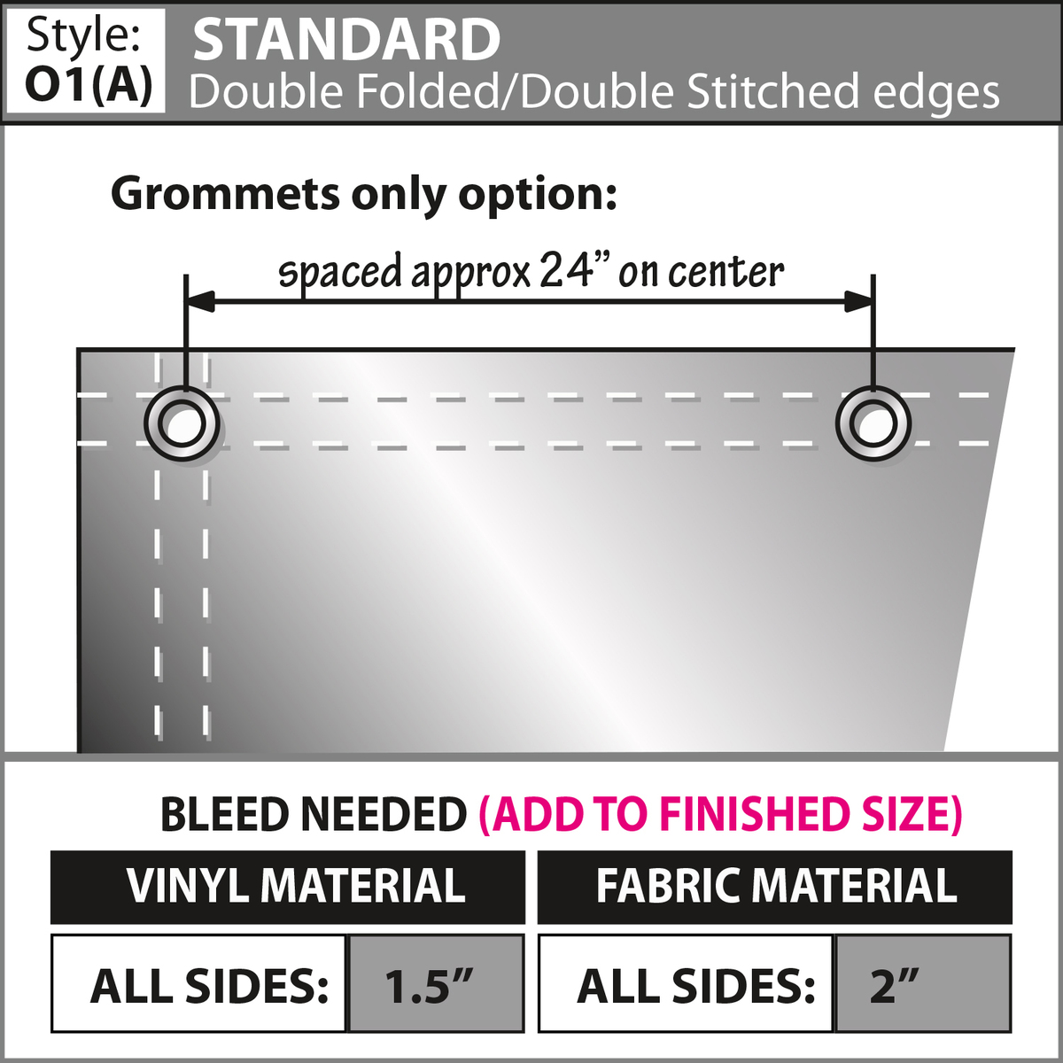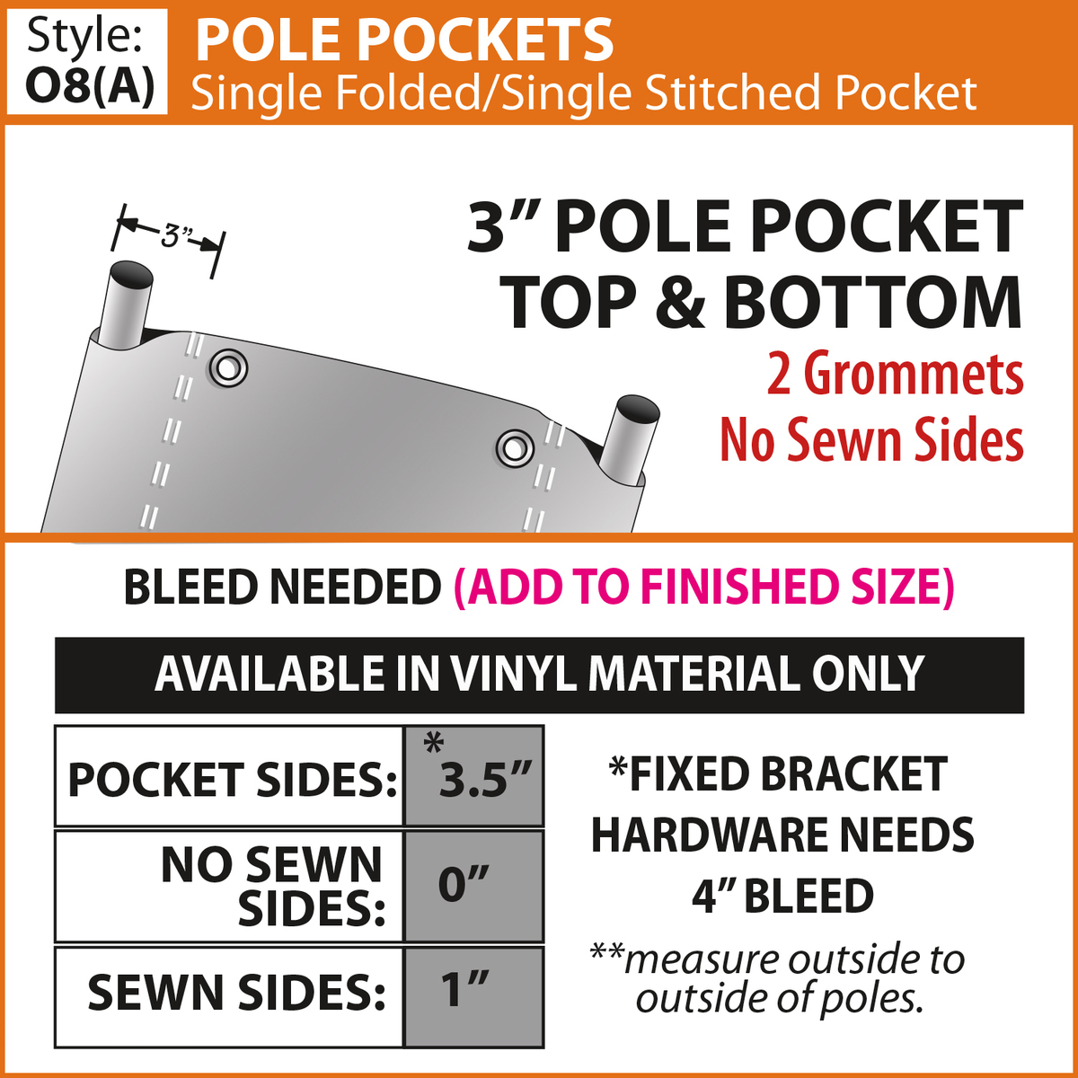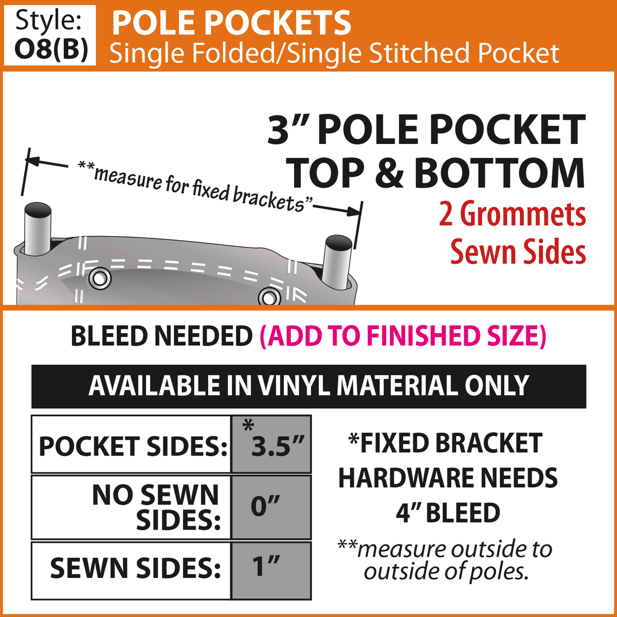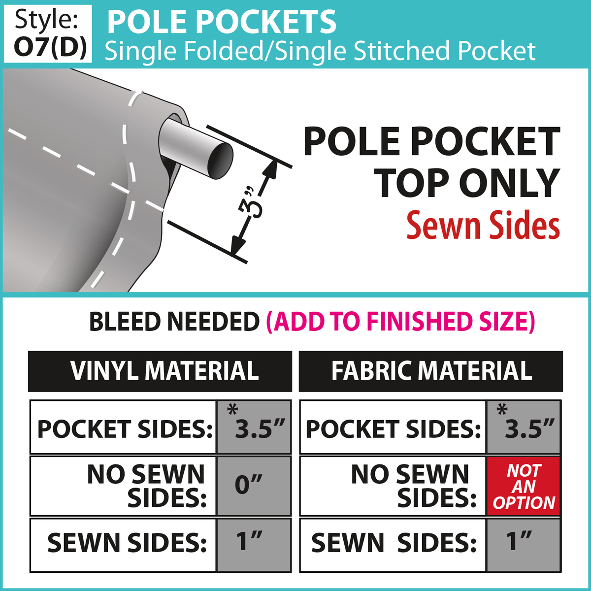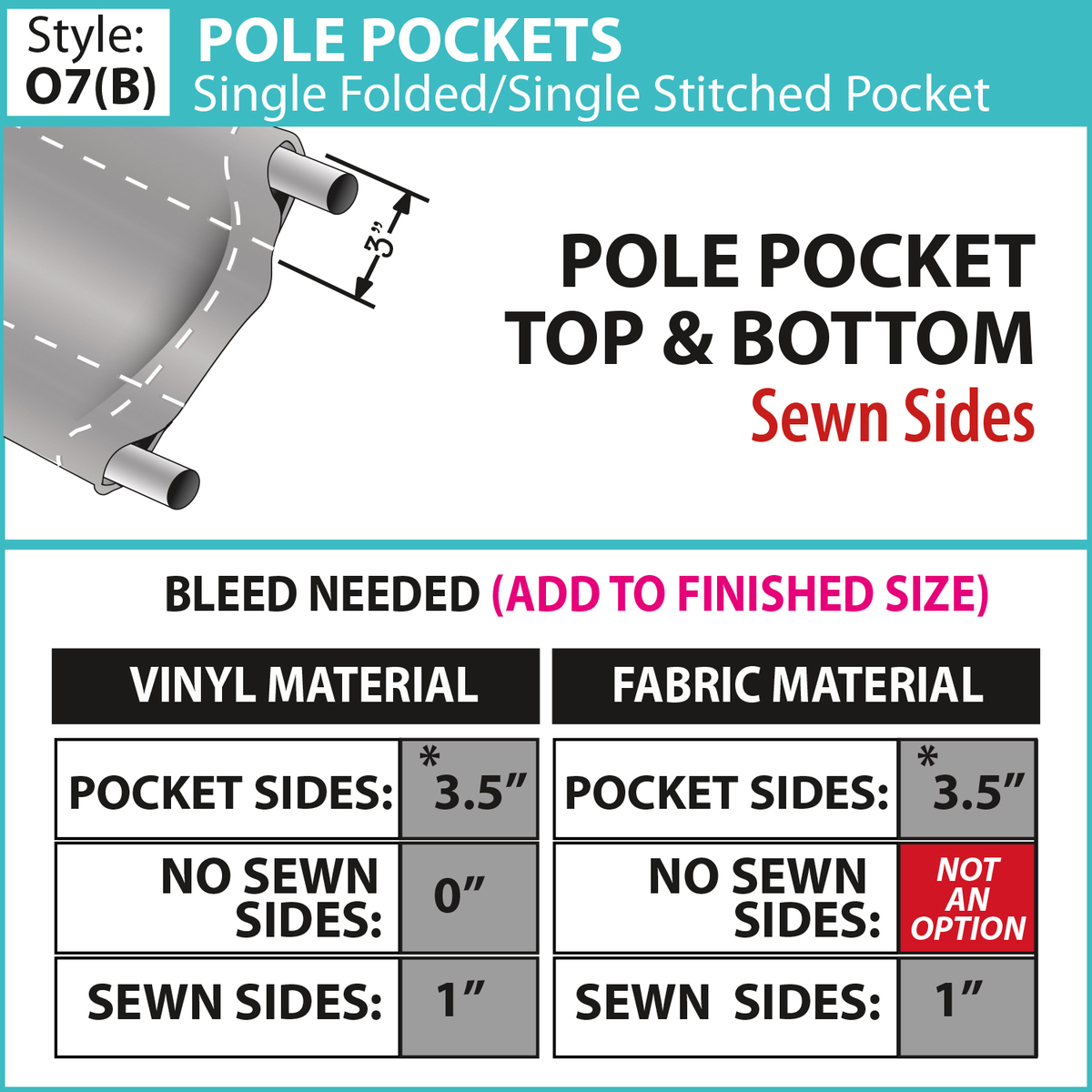 - Choose from multiple finishing styles (our standard 3" pole pocket will accommodate up to a 1.25" diameter pole)
